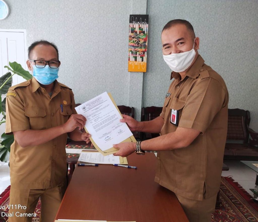 DPMTK – Kadis PMTK H. Asmadi, S.Pd, M.Si menyerahakan Dokumen Perjanjian Kinerja Berjenjang kepada Pejabat Struktural Eselon III dan Eselon III kepada Eselon IV serta Eselon IV kepada staf di ruang kadis. Senin, 8 Februari 2021.