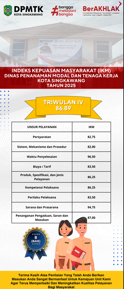 BeritaIKM Indeks Kepuasan Masyarakat DPMTK Triwulan IV Tahun 2025 Penulis Media Center DPMTK - 23 Februari 2026 1 FacebookTwitterPinterestWhatsApp About Author Media Center DPMTK See author's posts