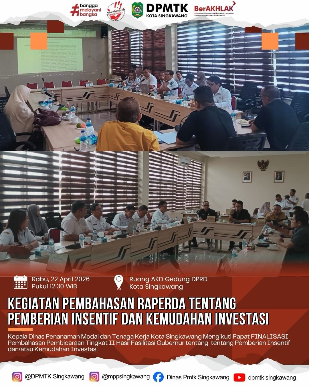 Berita Pembahasan Raperda tentang Pemberian Insentif dan Kemudahan Investasi Penulis Media Center DPMTK - 23 April 2026 4 FacebookTwitterPinterestWhatsApp Ruang AKD Gedung DPRD Kota Singkawang Kegiatan Pembahasan Raperda tentang Pemberian Insentif dan Kemudahan Investasi. About Author Media Center DPMTK See author's posts