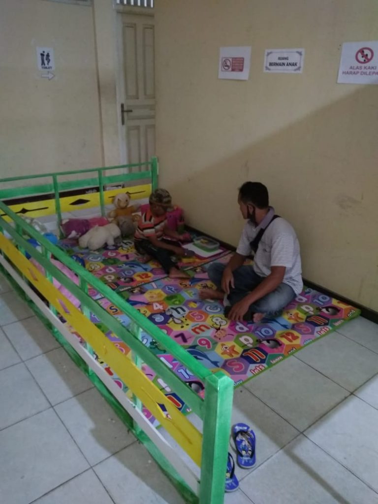 DMPTK – Pemohon perizinan yang membawa anak sedang menemani anaknya di ruang bermain anak, sambil menunggu proses perizinan yang dilakukanya selesai.