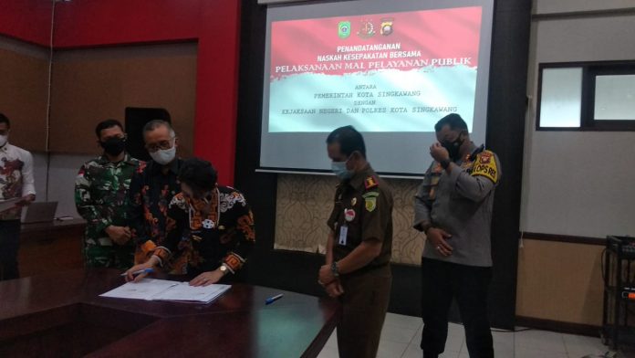 DPMTK – Walikota Singkawang Tjhai Chui Mie, SE, MH melakukan penandatanganan naskah kesepakatan bersama pelaksanaan Mal Pelayanan Publik antara Pemerintah Kota Singkawang dan Kejaksaan Negeri dan Polres Kota Singkawang. Kamis, 20 Mei 2021