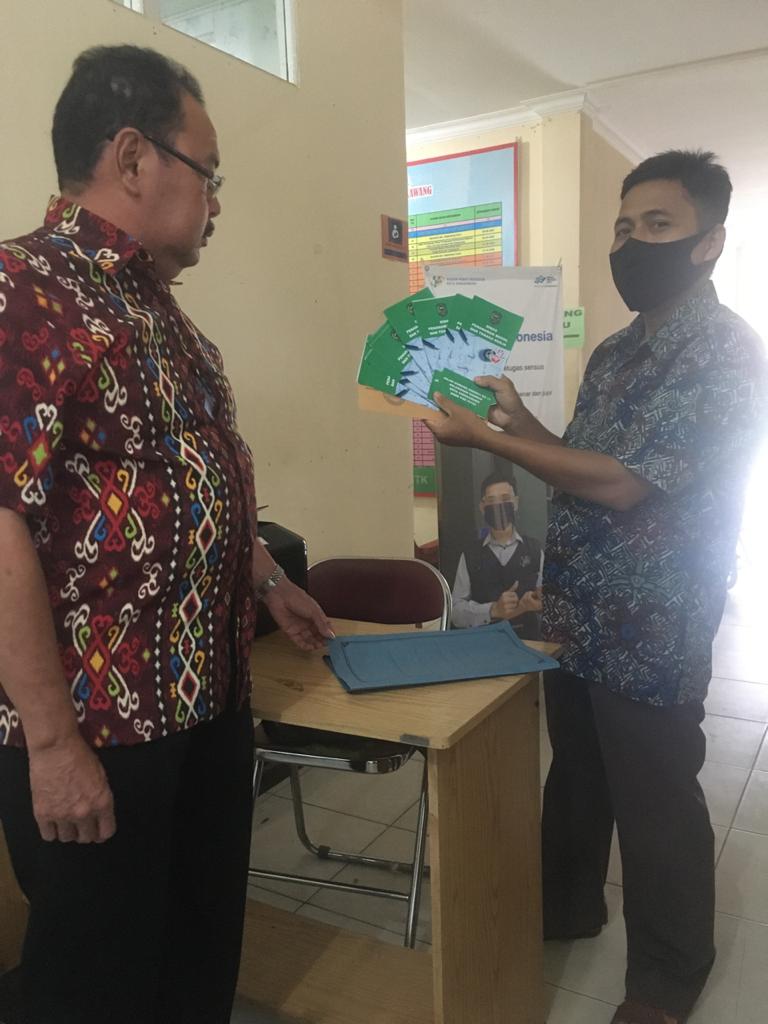 DPMTK- Sekretaris Dinas PMTK Lukas Suharyadi, S.Sos menyerahkan brosur/pamflet DPMTK kepada Camat Singkawang Barat yang diterima oleh Kasubbag Program, Keuangan dan Aset. Kamis, 10 September 2020