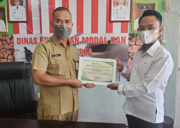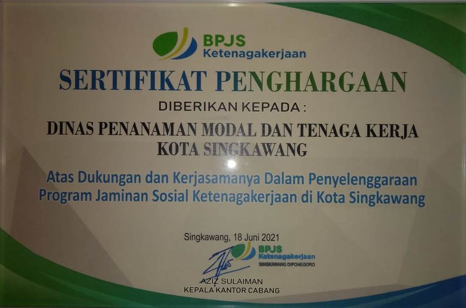 DPMTK – BPJS Ketenagakerjaan Singkawang memberikan sertifikat penghargaan kepada Kadis PMTK H. Asmadi, S.Pd, M.Si atas dukungan dan kerjasamanya dalam Penyelenggaraan Program Jaminan Sosial Ketenagakerjaan di Kota Singkawang.