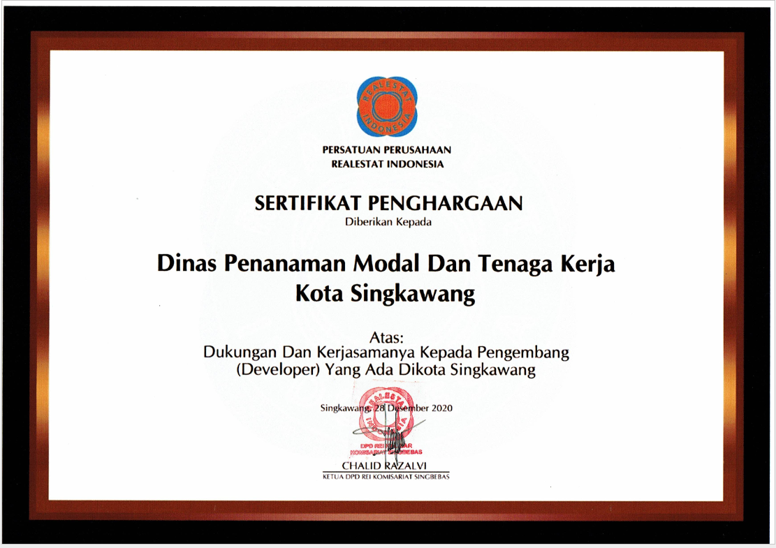 DPMTK – Persatuan Perusahaan Realestat Indonesia memberikan sertifikat penghargaan kepada Dinas PMTK atas dukungan dan kerjasamanya kepada Pengembang (Develover) yang ada di Kota Singkawang