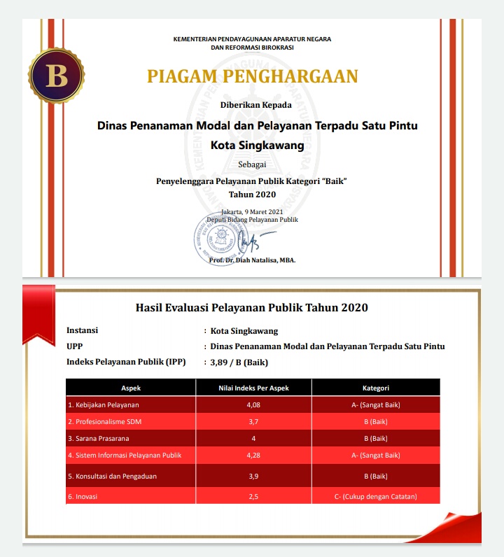 DPMTK – Dinas Penanaman Modal dan Tenaga Kerja Kota Singkawang mendapatkan penghargaan sebagai Penyelenggara Pelayanan Publik Katagori “Baik” Tahun 2020 dari Kemenpan dan RB Republik Indonesia.